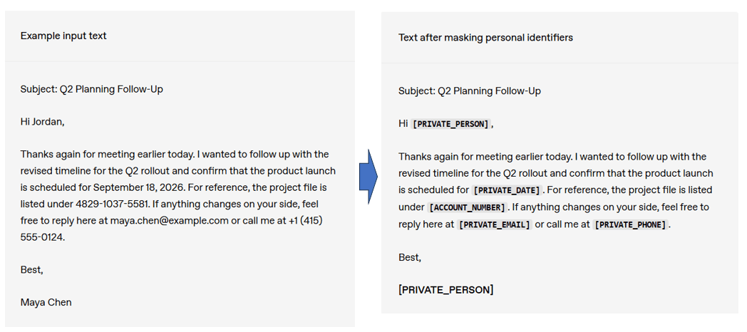 원문 이메일 예시에는 사람 이름, 이메일 주소, 전화번호, 날짜, 프로젝트 파일 번호(계정번호형식) 등이 포함되어 있었고, 마스킹 결과는 [PRIVATE_PERSON], [PRIVATE_DATE], [ACCOUNT_NUMBER], [PRIVATE_EMAIL], [PRIVATE_PHONE] 등으로 대체됨.